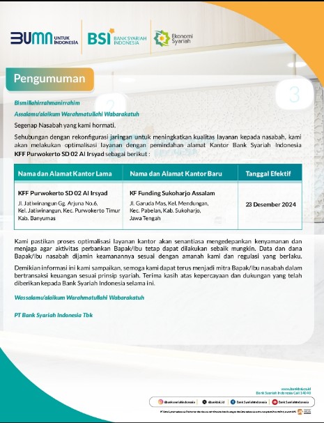 BSI akan memindahkan layanan dari KFF Purwokerto SD 02 Al Irsyad, yang berlokasi di: