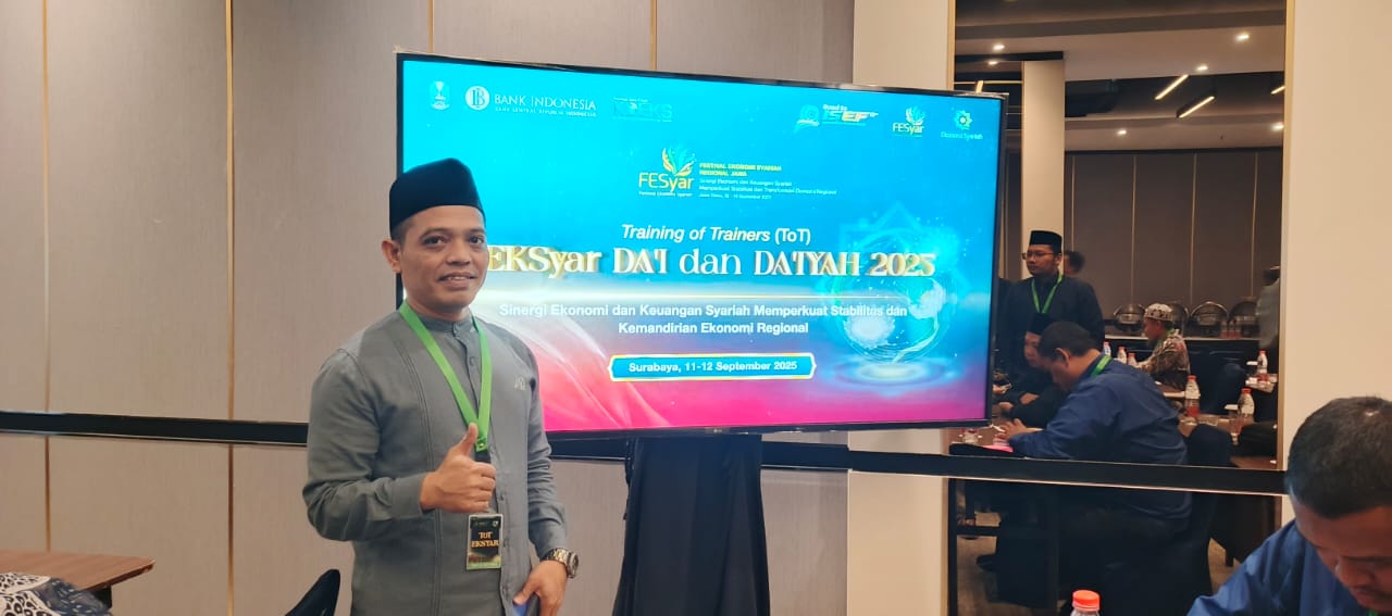 PURWOKERTO – Ketua PC Lembaga Dakwah Nahdlatul Ulama (LDNU) Banyumas, Gus M Sa’dullah, ikuti Training of Trainers (TOT) Dai dan Daiyah Ekonomi Syariah. Agenda ini menjadi bagian dari rangkaian Festival Ekonomi Syariah (FESYar) Jawa 2025 yang digelar Bank Indonesia (BI) di Surabaya, pada 11–12 September 2025.