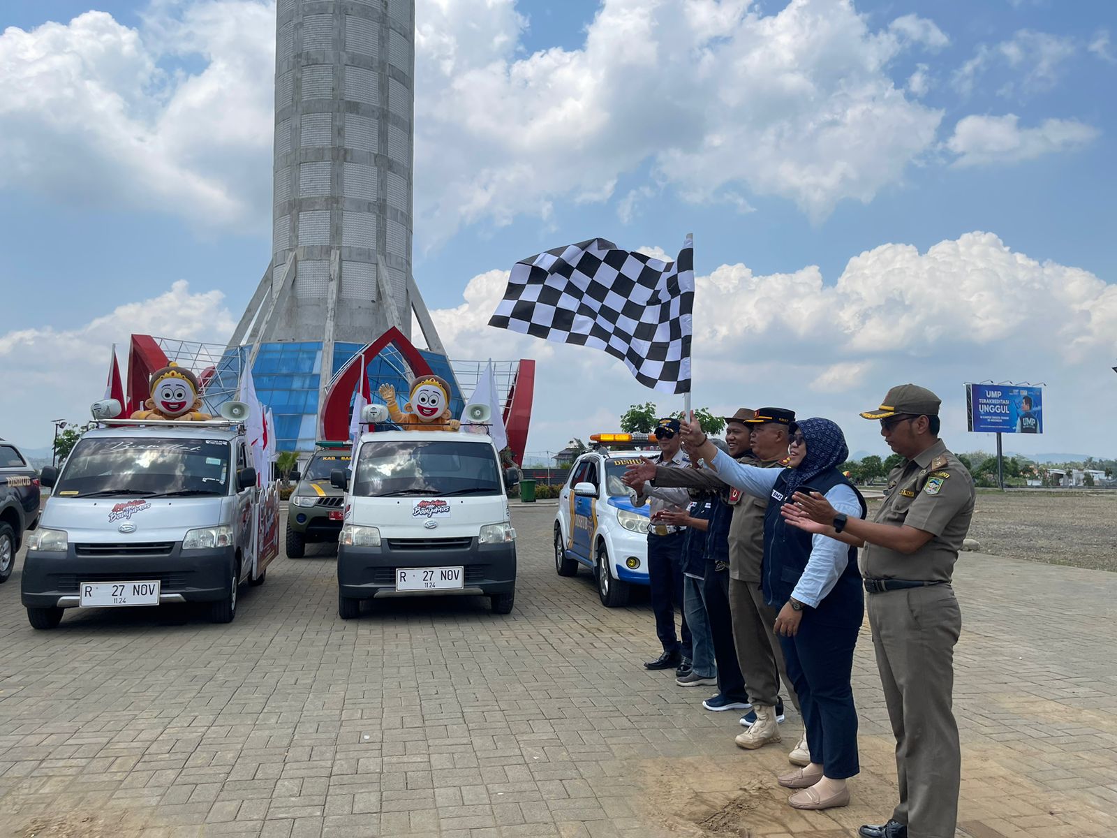 PURWOKERTO – Ketua Komisi Pemilihan Umum (KPU) Kabupaten Banyumas, Rofingatun Khasanah melepas Kirab Pilkada 2024 KPU Kabupaten Banyumas di Halaman Menara Teratai Purwokerto, Senin (7-10). Acara pelepasan ini turut didampingi oleh Dinas Perhubungan dan Satpol PP Kabupaten Banyumas.