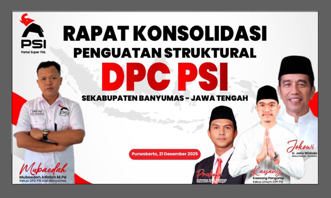 PURWOKERTO – Dewan Pimpinan Daerah (DPD) Partai Solidaritas Indonesia (PSI) Kabupaten Banyumas menggelar Rapat Konsolidasi Penguatan Struktural, Minggu (21/12/2025), di Purwokerto. Kegiatan ini menjadi langkah awal strategis dalam menyongsong masa kepengurusan DPD PSI Banyumas periode 2025–2030.
