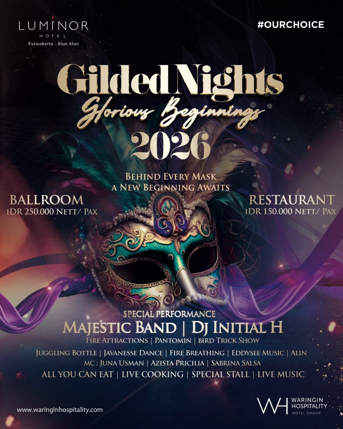 PURWOKERTO – Menyambut pergantian tahun, Luminor Hotel Purwokerto – Alun-Alun kembali menghadirkan sebuah perayaan malam tahun baru yang dirancang eksklusif dan penuh kemewahan. Mengusung tajuk “Gilded Nights: Glorious Beginnings 2026”, acara ini siap memanjakan masyarakat Purwokerto dengan konsep masquerade party yang elegan dan pengalaman hiburan yang lengkap.
