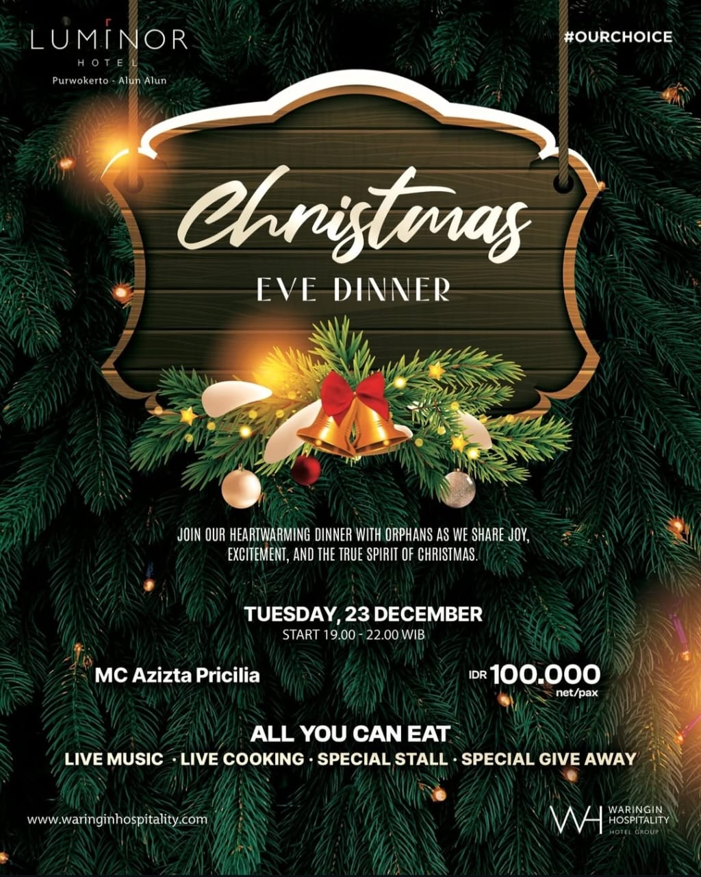 Mengusung konsep all you can eat, Christmas Eve Dinner Luminor Hotel Purwokerto menyajikan beragam hidangan spesial Natal, lengkap dengan live music, live cooking, special stall, serta berbagai giveaway menarik. Suasana kian semarak dengan panduan MC Azizta Pricilia yang membawakan acara secara hangat dan interaktif. Paket makan malam Natal ini ditawarkan dengan harga terjangkau, yakni Rp100.000 net per pax.
