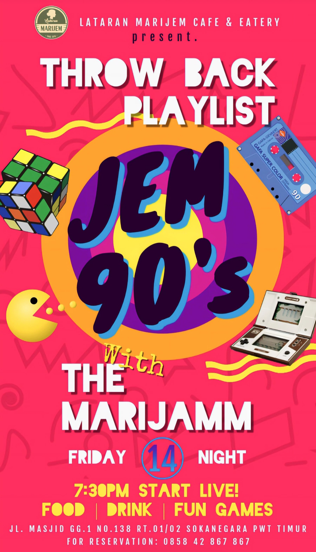 PURWOKERTO — Marijem Cafe & Eatery kembali menghadirkan hiburan spesial bagi para penikmat musik era 90-an. Lewat gelaran bertajuk “Throw Back Playlist – GAFA Super Color 90 & JEM 90’s”, kafe yang berlokasi di Jl. Masjid Gg.1 No.138, RT 01/02, Sokanegara, Purwokerto Timur itu siap membawa pengunjung bernostalgia dengan lantunan lagu-lagu klasik yang pernah merajai masanya.