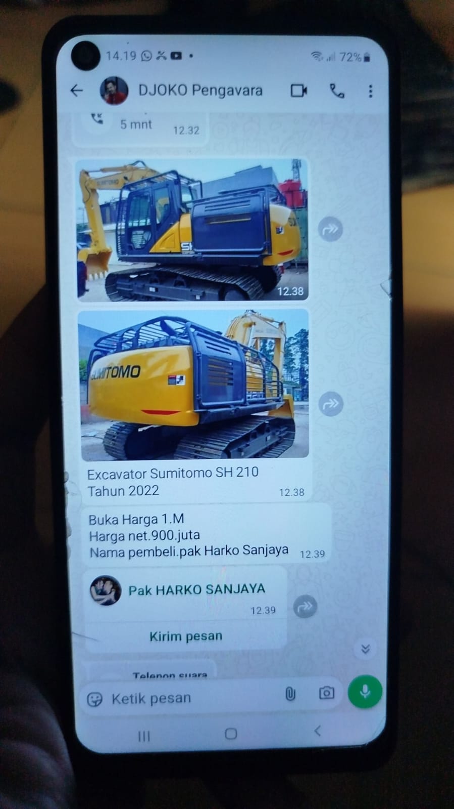 Tak sekadar pesan teks, akun tersebut juga tercatat melakukan panggilan suara dan video call, serta mengirimkan foto dan video alat berat jenis excavator Sumitomo SH 210 tahun 2022, lengkap dengan keterangan harga dan nama calon pembeli. Dalam percakapan itu, turut disebutkan aktivitas lapangan, mulai dari pengiriman orang ke lokasi hingga penggunaan kendaraan tertentu.