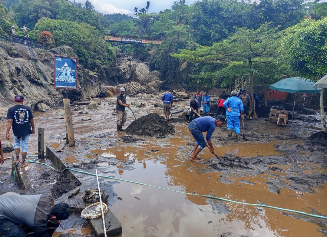 BANYUMAS – Petugas loka wisata Baturraden Banyumas langsung melakukan pembersihan area yang terdampak usai banjir bandang yang membawa lumpur dan pasir pada Sabtu 24 Januari 2026 dini hari.