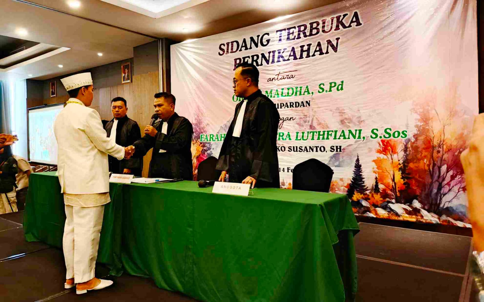 Dekorasi ruangan ditata layaknya ruang sidang, lengkap dengan meja hakim, palu sidang, serta susunan kursi formal. Bahkan terdapat penanda bertuliskan “Hakim Ketua” berlatar hijau di meja utama, semakin menguatkan atmosfer persidangan dalam prosesi pernikahan tersebut.