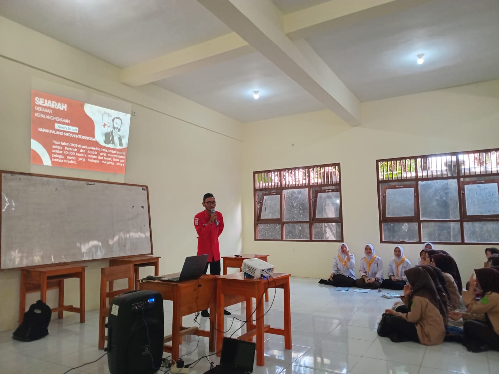 Materi yang disampaikan mencakup sejarah berdirinya gerakan Palang Merah dan Bulan Sabit Merah Internasional, lambang gerakan, serta penjelasan tentang 7 prinsip dasar yang menjadi pedoman organisasi ini. Peserta juga diajak mengenal lebih dekat tentang peran dan struktur PMI, khususnya PMI Kabupaten Banyumas.
