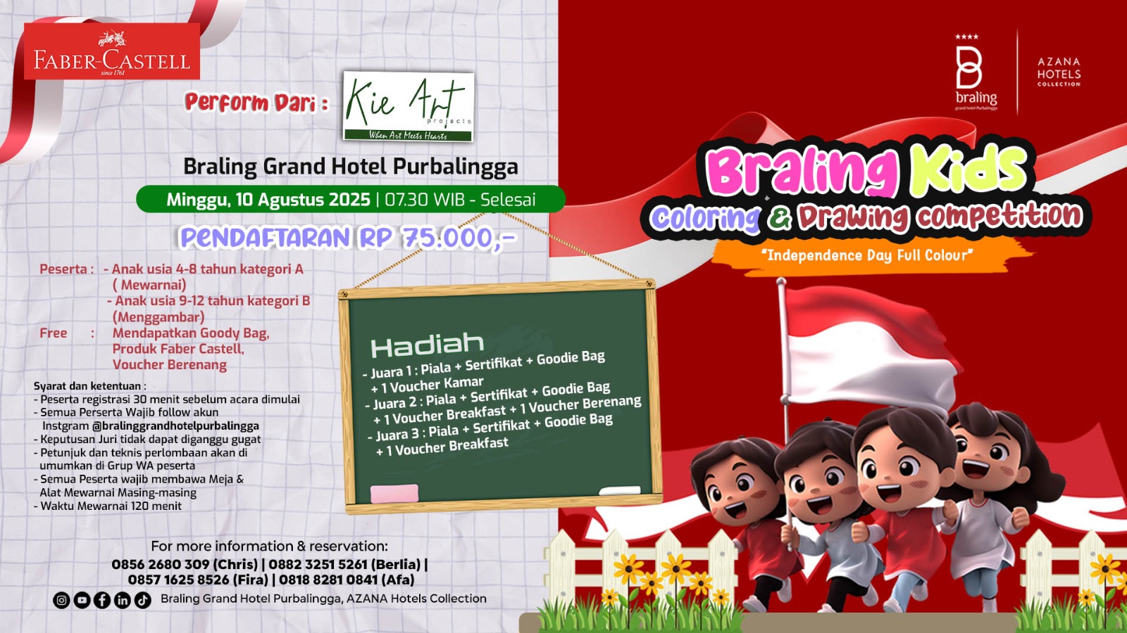 PURBALINGGA – Menyambut peringatan 80 tahun Kemerdekaan Republik Indonesia, Braling Grand Hotel Purbalingga yang tergabung dalam jaringan Azana Hotels Collection menggelar kegiatan spesial bertajuk “Braling Kids Coloring & Drawing Competition – Batch 2”. Acara ini akan berlangsung pada Minggu, 10 Agustus 2025, di area hotel yang berada di pusat kota Purbalingga.