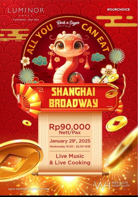 PURWOKERTO – Tahun Baru Imlek 2025 sudah di depan mata! Dalam semangat Shio Ular yang melambangkan kebijaksanaan, kecerdasan, dan transformasi, **Luminor Hotel Purwokerto** mengundang Anda untuk menikmati momen spesial penuh kebahagiaan dan keberuntungan melalui acara eksklusif Shanghai Broadway – All You Can Eat.