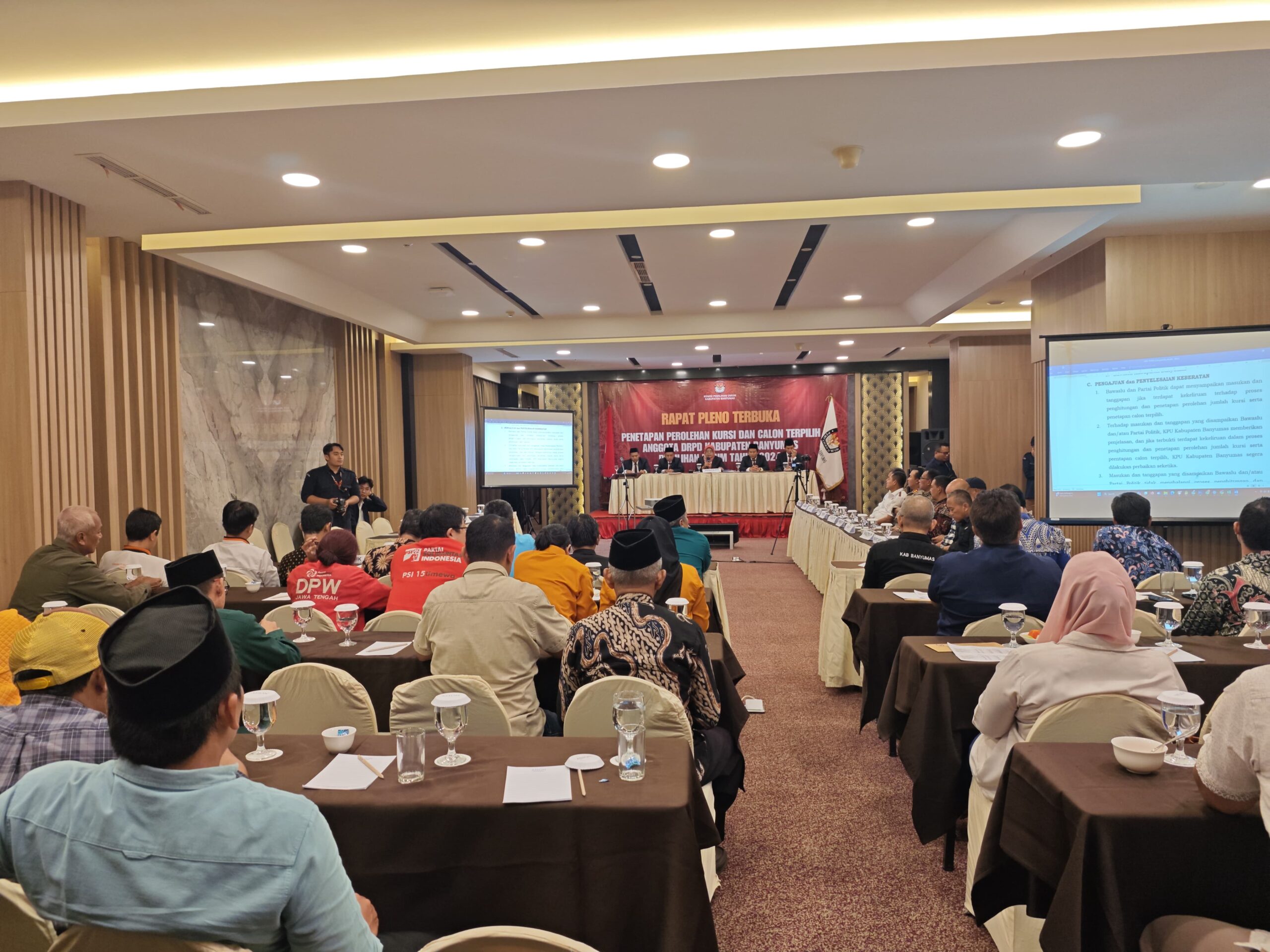 PURWOKERTO, Komisi Pemilihan Umum (KPU) Banyumas melakukan rapat pleno jumlah kursi dan calon legislatif terpilih, Selasa (28/5/2024). Pleno dipimpin Ketua KPU Rofingatul Khasanah komplit dengan seluruh komisioner. Perwakilan partai politik peserta pemilihan umum juga tampak hadir di Hotel Aston, tempat pleno berlangsung.