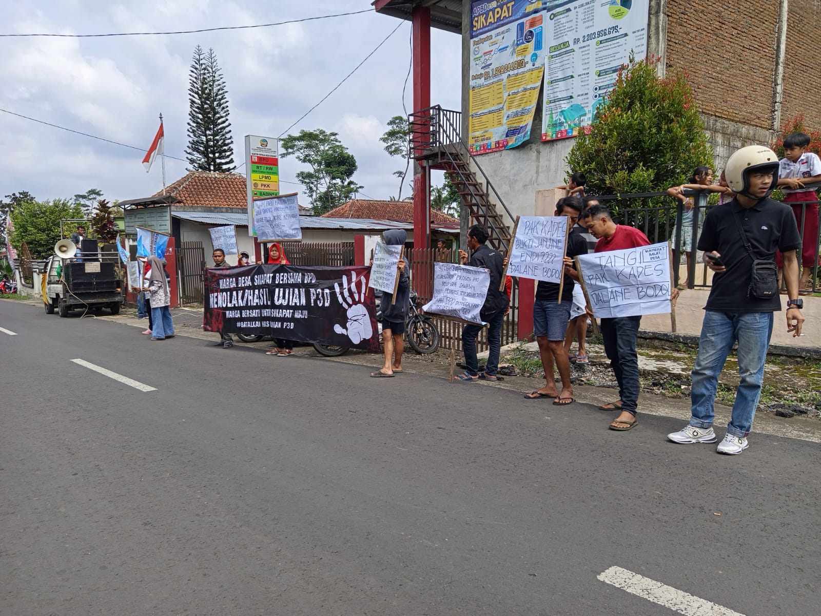 Spanduk yang dibawa warga bertuliskan, “Warga Sikapat Menolak Politik Dinasti”, “Batalkan Hasil Tes P3D”, “Pejabate Jujur Programe Teratur Rakyate Makmur”, hingga “Politik Dinasti Ciderai Demokrasi”. Sebuah banner besar juga dibentangkan bertuliskan: “Warga Desa Sikapat Bersama BPD Menolak Proses dan Hasil Ujian P3D, Warga Bersatu untuk Sikapat Maju #Batalkan Hasil Ujian P3D.”